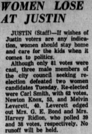 They lost to Carl Smith, who received 62 votes, Newton Knox (owner of Justin Bank) with 53 votes, and Melvin Leverett with 40 votes. With three council positions available, both women came extremely close, falling short by just one and two votes respectively.