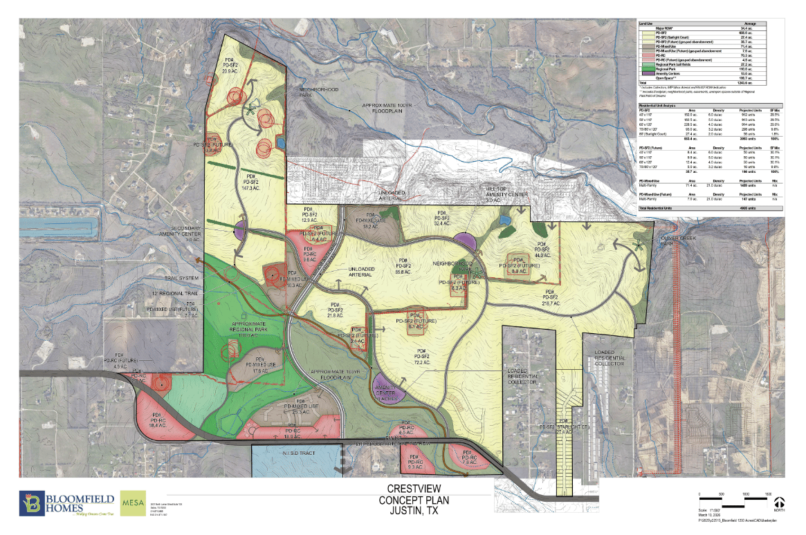 The City of Justin has approved a major zoning change paving the way for Crestview, a 1,244-acre master-planned community by Bloomfield Homes, located north and northwest of FM 407 and Treeline Parkway.
